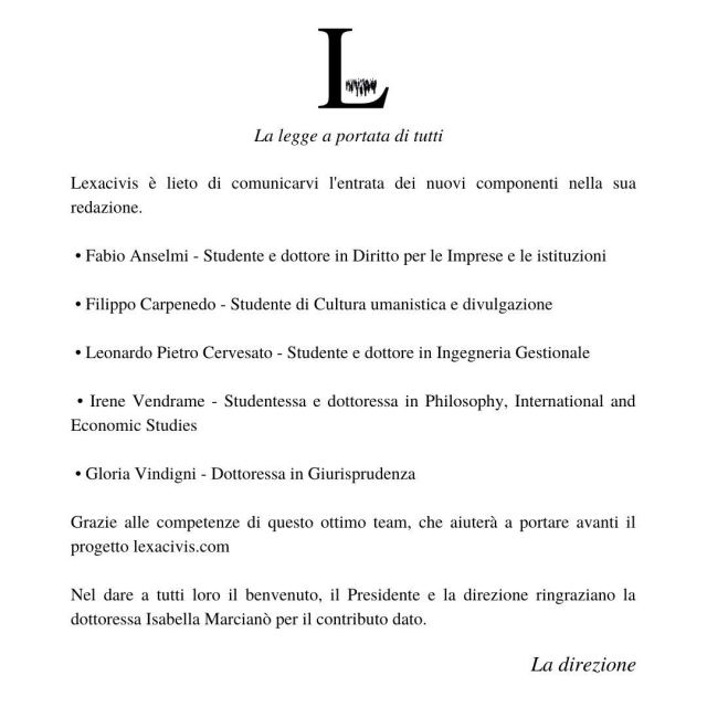 I nuovi membri della redazione Lexacivis 5 dicembre 20205 dicembre 2020 / Lexacivis Condividi: Fai clic per condividere su X (Si apre in una nuova finestra) X Fai clic per condividere su Facebook (Si apre in una nuova finestra) Facebook Mi piace Caricamento... Correlati